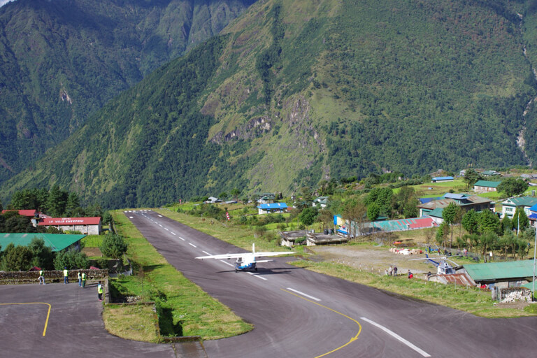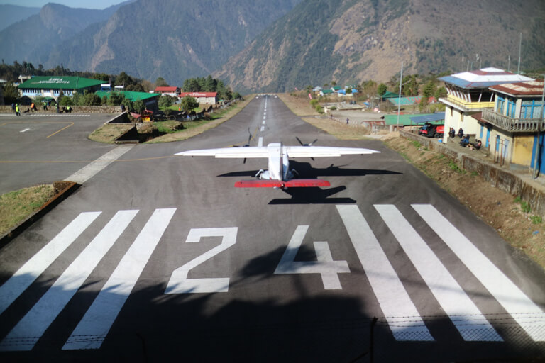ルクラの空港は山の中のため、平らな土地がないために滑走路の長さが足らず、滑走路が坂になっていて、着陸はその坂の抵抗でブレーキをかけ、離陸は坂の勢いで加速します。