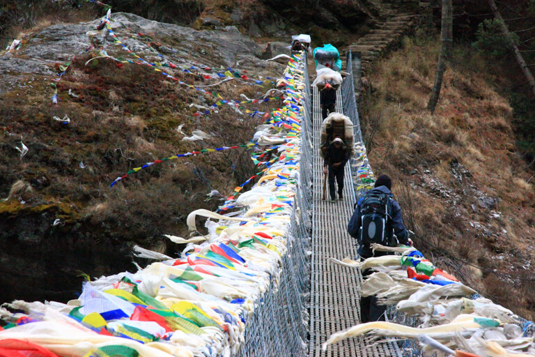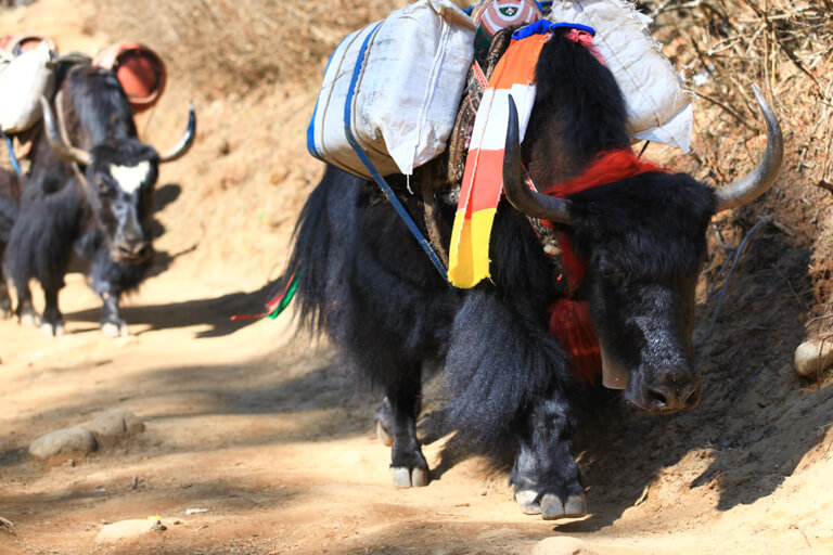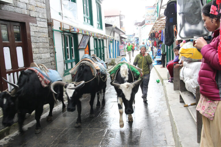 荷物はゾッキョ(ヤクと牛の掛け合わせ)やポーターたちよって、先ベースキャンプに向けて運ばれていきます。