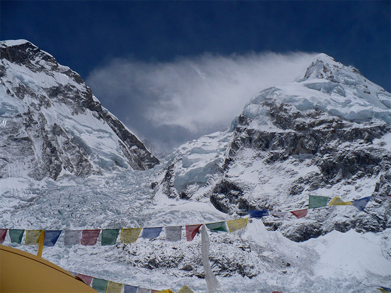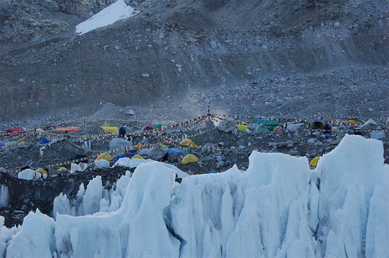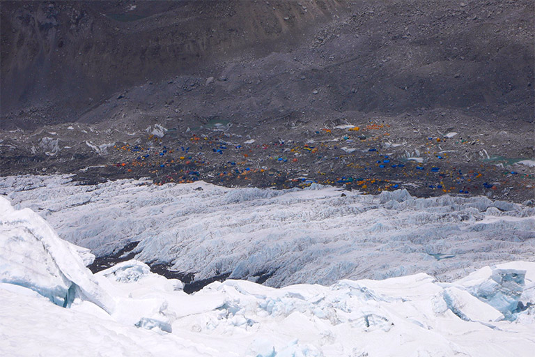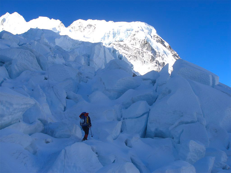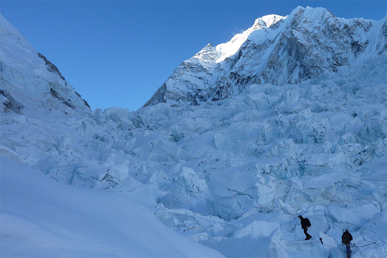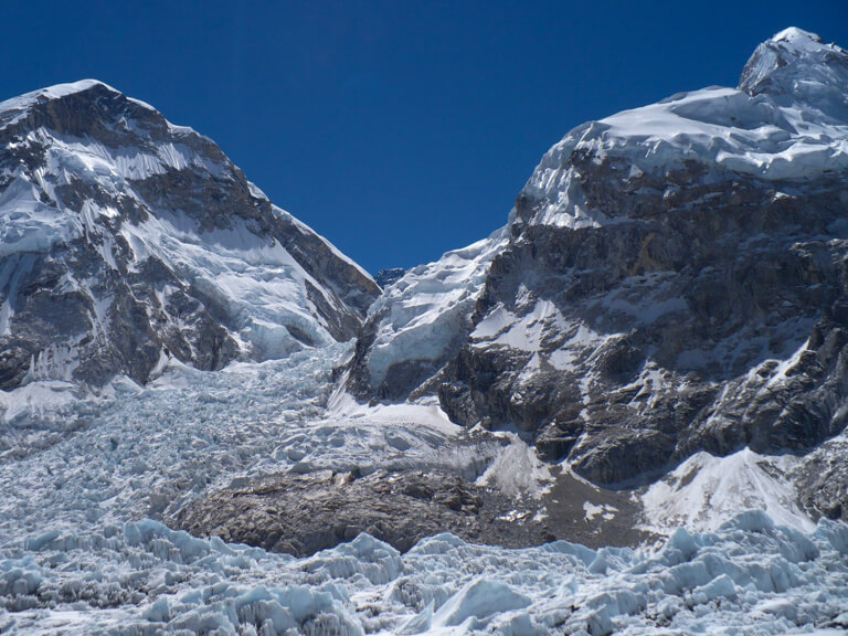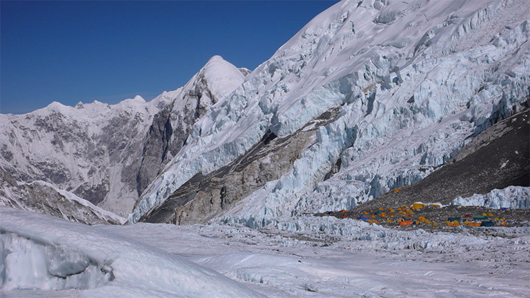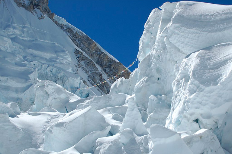 アイスフォールの名の通り、氷が滝となって動き続けていて、常に崩れてる。